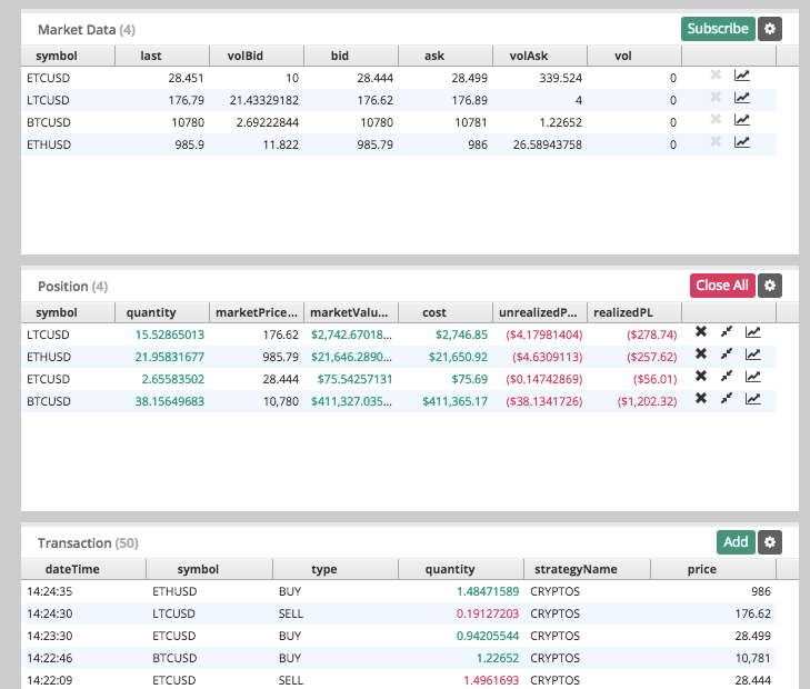 The system has a lot to offer technical traders. You have the ability to process live market data, plus automated downloads of Coinigy accounts, exchanges, as well as currency pairs into AlgoTrader.