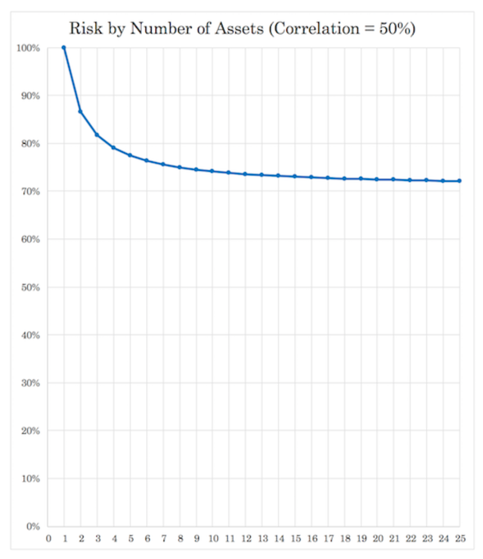 If you have one thousand stocks, you’re reducing your risk by about 15 percent. Even after 4-5 returns streams, your marginal benefit is less than one percent when adding each one.