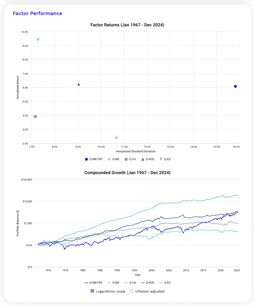 Value, profitability, and investment provide moderate returns with lower risk and useful diversification (due to low or negative correlations with the market).