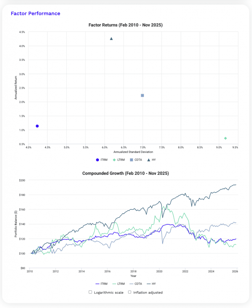 | Factor | Key | ITRM | LTRM | CDT | HY | Annualized Return | Annualized Standard Deviation |