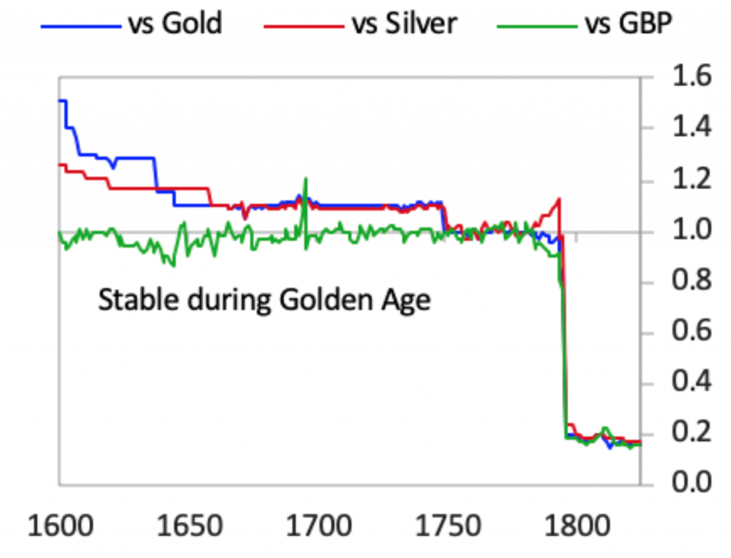 The expense incurred from the war bankrupted the Dutch. It caused the collapse of Dutch debt and equity markets, as well as the value of the Dutch guilder, as illustrated in the following diagram versus gold, silver, and the British pound (GBP).