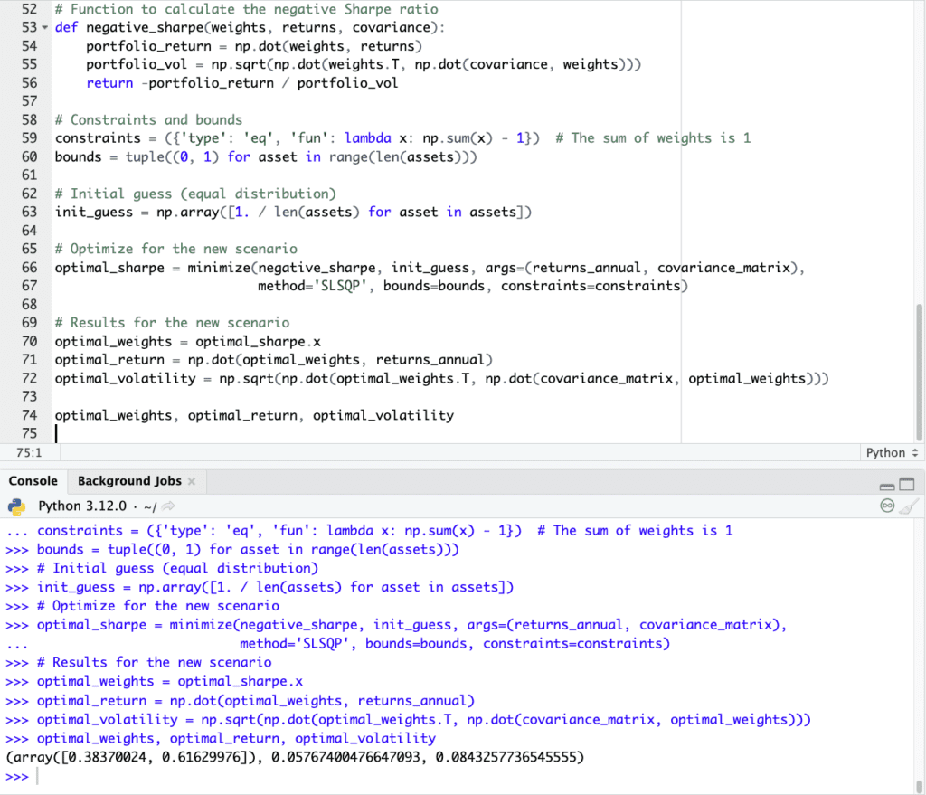 Here’s our Python code, where we design an optimized portfolio between stocks and bonds.