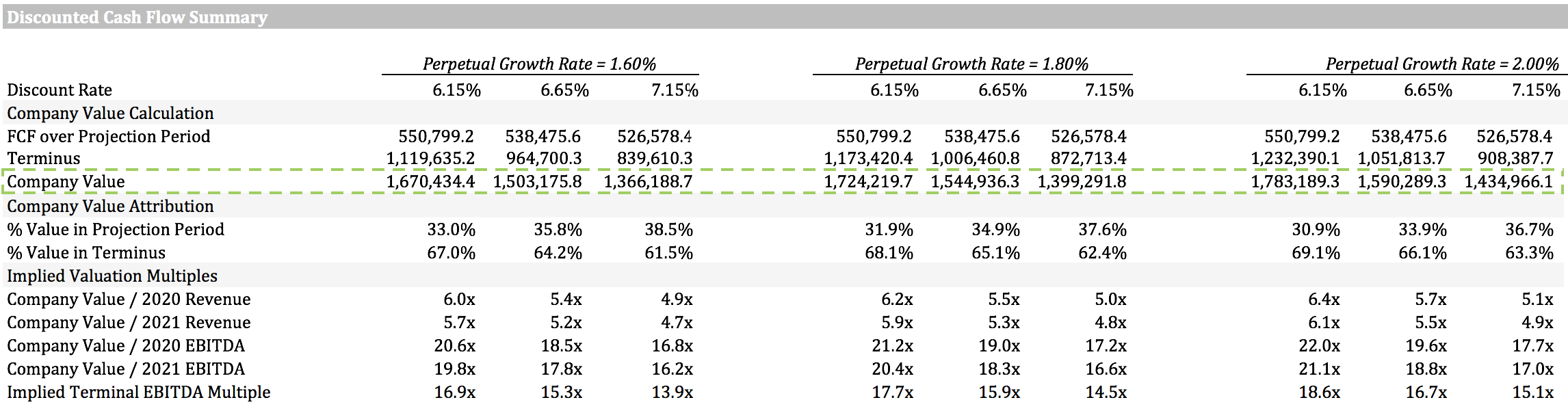 We can also infer from the perpetuity growth model what this terminal EBITDA multiple would be. Based on these projections it would come to around 16x.