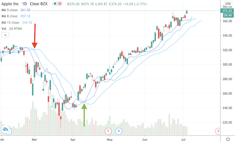 Some might use moving average crossovers as buy and sell signals. Such events, usually involving 2-3 moving averages, are meant to be taken as a change in trend when they all crossover from a previous trend and align with the new one. The longest moving average will crossover last to “confirm” the new trend.