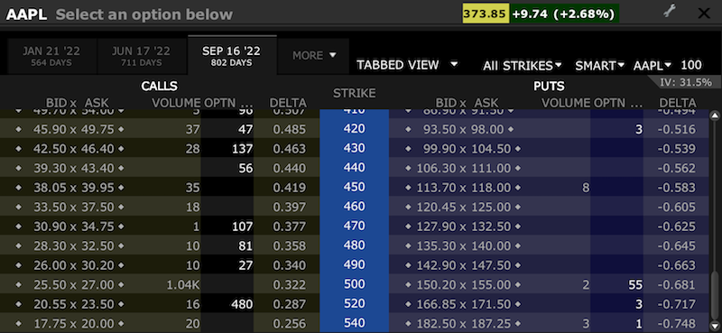 The September 2022 500 call currently trades at a spread of $25.50 to $27.00 per share.