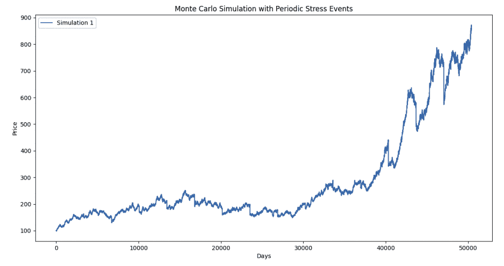 Generates synthetic stock prices with periodic stress events using Monte Carlo simulation.