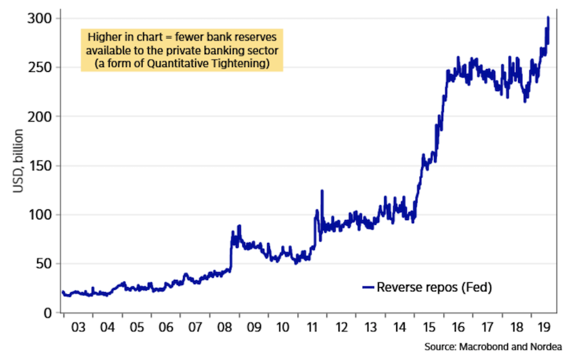 Moreover, foreign central banks and other official accounts can use a reverse repo program with the Federal Reserve. When the reverse repo program is utilized, the amount of bank reserves available to financial institutions shrinks. Since October 2018, this reverse repo pool has grown from $215 billion to more than $300 billion. The has reduced USD liquidity by about $85 billion, another form of quantitative tightening.