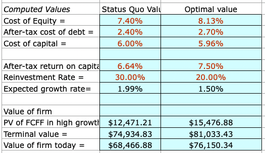 5. If the firm has potential for competitive advantages, see if you can lengthen the growth period (will work only if there are positive excess returns). This is the marginal pre-tax return on capital that you believe that you can earn on new investments. Check the computed values for the after-tax value and how it compares to your cost of capital